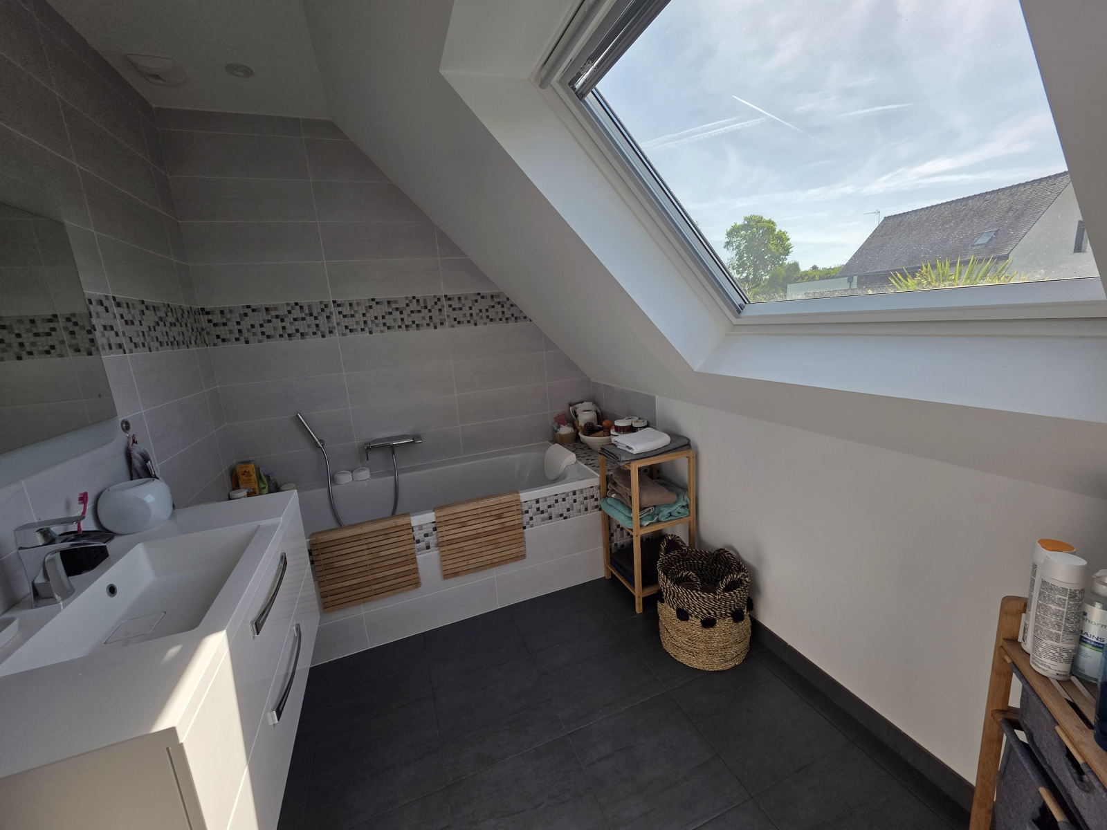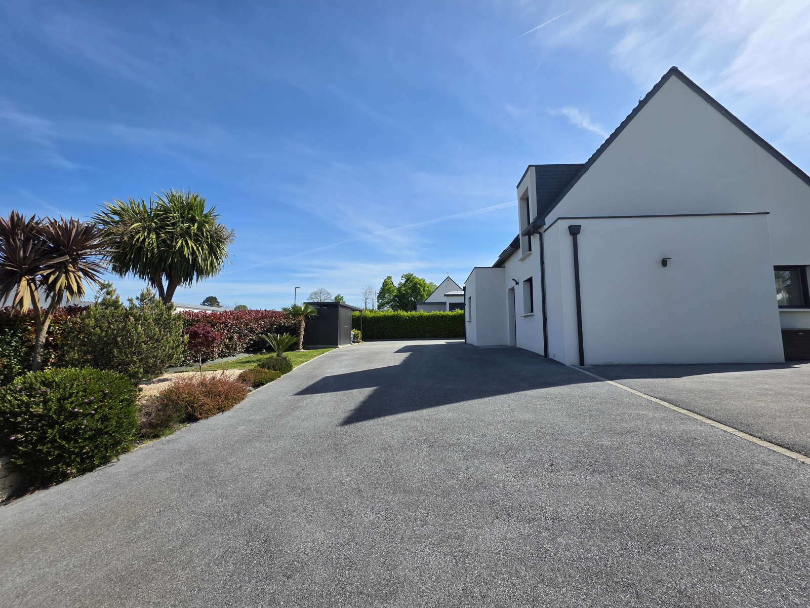 Les extérieurs sont aussi soignés que l’intérieur : allée et parkings enrobés, abri de jardin en aluminium, clôtures et plantations variées.